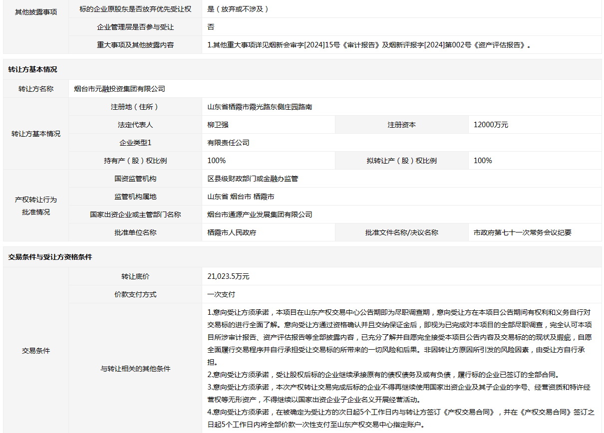 轉(zhuǎn)讓方: 煙臺(tái)市元融投資集團(tuán)有限公司
