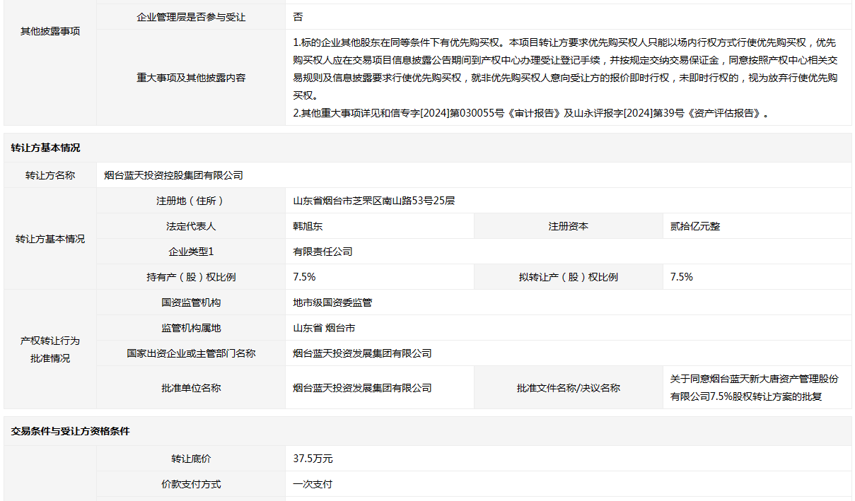 煙臺藍天新大唐資產管理股份有限公司7.5%股權(37.5萬股股份)