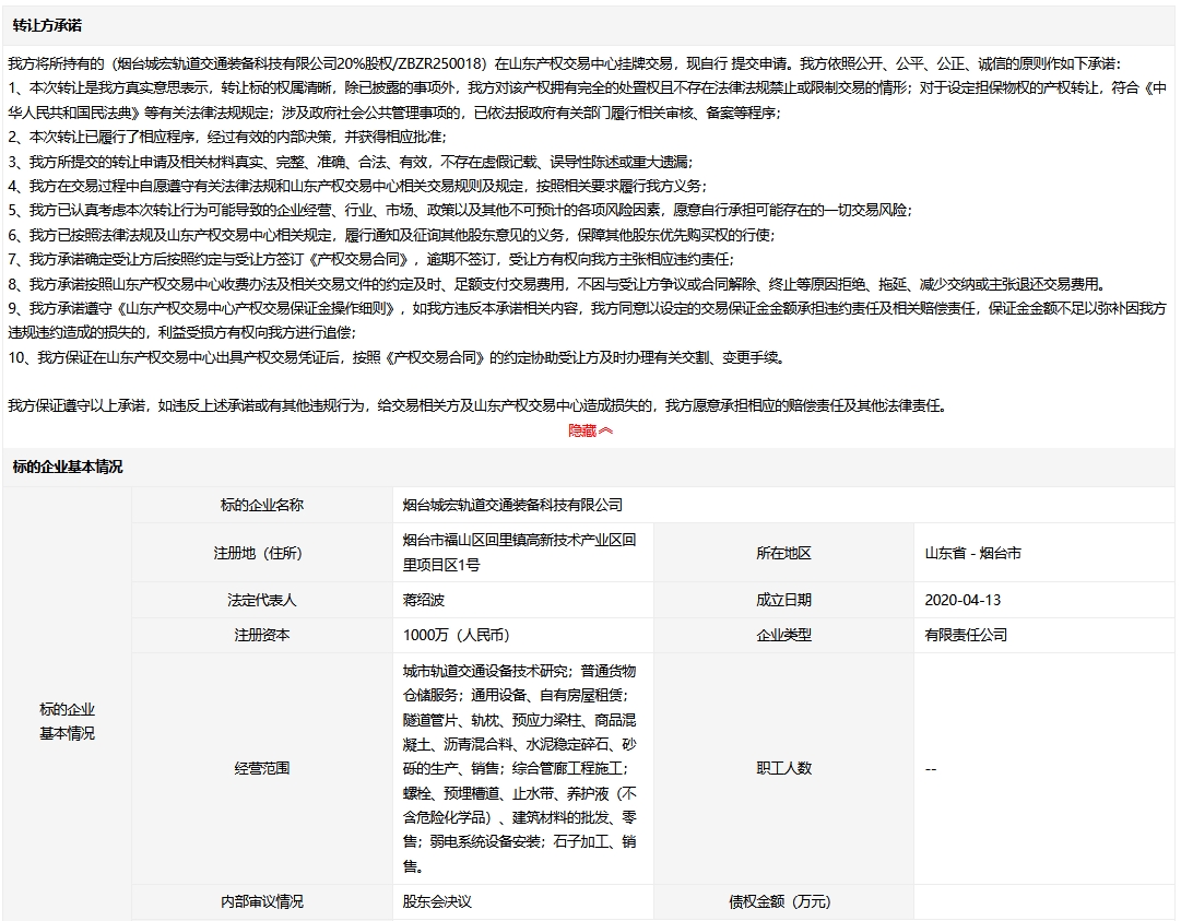 煙臺城宏軌道交通裝備科技有限公司20%股權(quán)