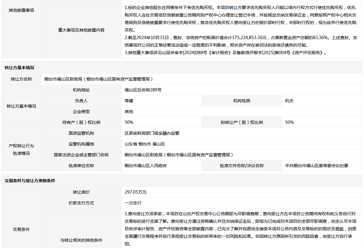 - 轉(zhuǎn)讓方: 煙臺市福山區(qū)財政局(煙臺市福山區(qū)國有資產(chǎn)監(jiān)督管理局)