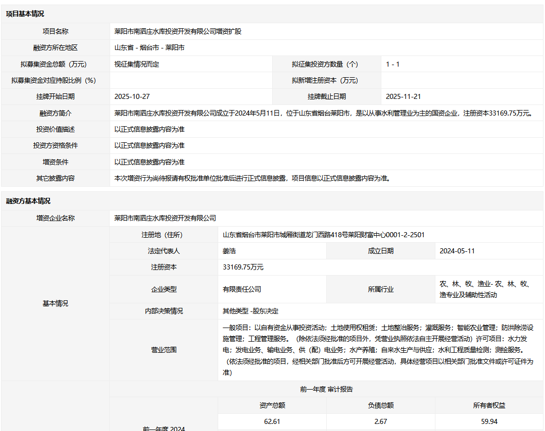萊陽市南泗莊水庫投資開發(fā)有限公司增資擴股