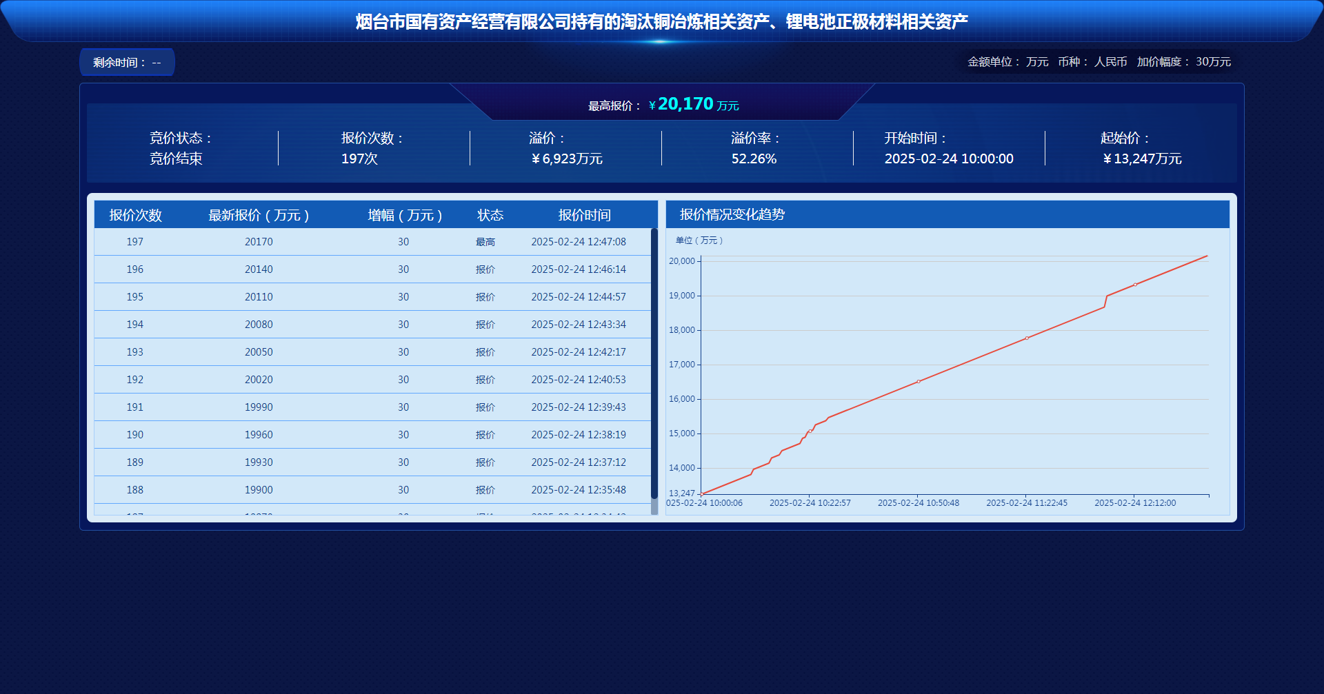 2月24日,“煙臺(tái)市國(guó)有資產(chǎn)經(jīng)營(yíng)有限公司持有的淘汰銅冶煉相關(guān)資產(chǎn)、鋰電池正極材料相關(guān)資產(chǎn)項(xiàng)目”在山東產(chǎn)權(quán)交易中心以網(wǎng)絡(luò)競(jìng)價(jià)方式成功出讓。此次交易歷經(jīng)197輪激烈競(jìng)價(jià),持續(xù)近3小時(shí),最終成交金額定格在20170萬(wàn)元,高于評(píng)估價(jià)8980萬(wàn)元,較掛牌價(jià)溢價(jià)6923萬(wàn)元,溢價(jià)率高達(dá)52.26%,成功創(chuàng)下煙臺(tái)聯(lián)合產(chǎn)權(quán)2025年首季資產(chǎn)盤活的“開門紅”。